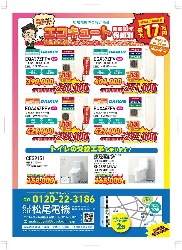 兵庫県西脇市にある松尾電機は、エコキュートの取付・修理はもちろん突然のトラブルにもしっかり対応。お見積りは完全無料なので、お気軽にお問合せください。
